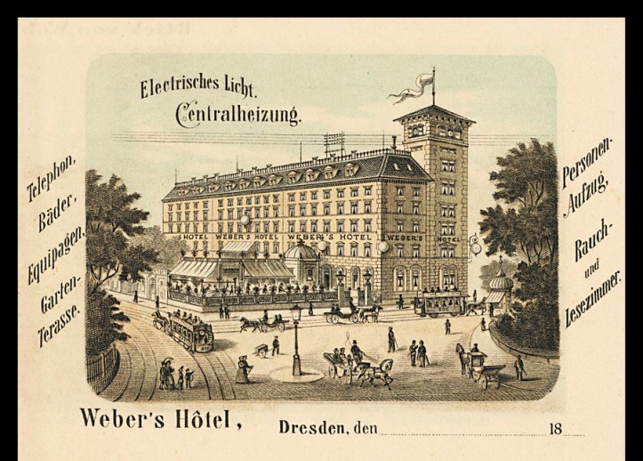 “July 31st, At 8:16 took train for Dresden. Weather glorious. John left us at Frankfort to go to Bayreuth. Told us to change cars at Eisenach. Mistake. Changed at Cob-beda (?) in pouring rain. Again at Leipsic (Leipzig). Couldn’t made guard or porter understand and owe success to a fine looking porter who simply walked in car and took our luggage and beckoned us to follow. We did as far full half a mile in rain to another station. There a pretty German girl, who spoke good English, helped us some. She gave us sandwiches and wine, the second one who came to our rescue. Couldn’t buy anything anywhere. Arrived at Dresden 9:30 and took carriage to Weber Hotel as Howard directed. Had dinner in room. Eva too wet to go down (got into bed at once at she had been sick all day.)