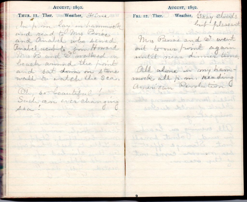 “August 28th, Cloudy and high wind. Had a delightful afternoon in hammocks. Anabel and I while Howard read aloud. Then H. and I went down on the beach. Half the sea dark blue and gray, the other half like moonlight. Woods looked beautiful from beach, different shades of green. Evening walk on beach, fine, water so low because of wind from west.”