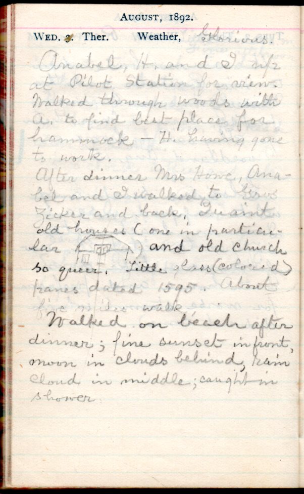 “August 3rd, Anabel, H. and I up at Pilot Station for view. Walked through woods with A. to find best place for hammock. H. having gone to work. After dinner Mrs. Howe, Anabel and I walked to Gross Zicker and back. Quaint old houses, one in particular (she then has a little drawing, shown below) and old church so queer. Little glass (colored) panes dated 1595. About five miles walk. Walked on beach after dinner; fine sunset in front, moon in clouds behind, rain cloud in middle, caught in shower.”