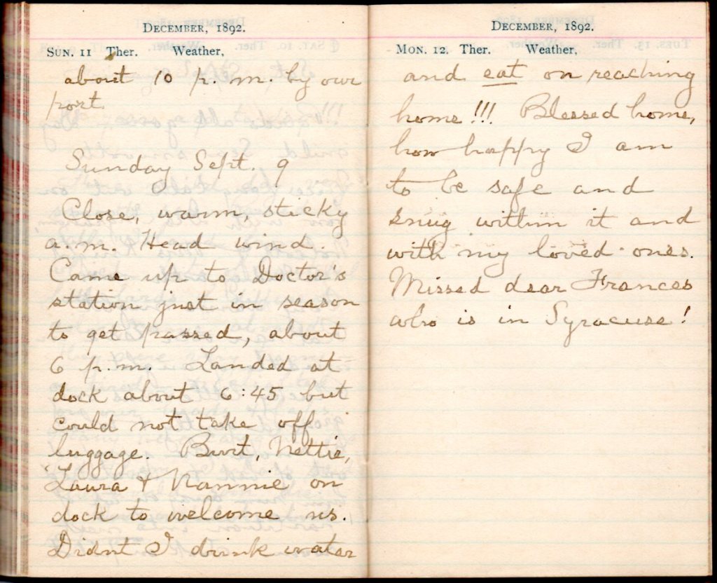 “September 9th, Close, warm, sticky a.m. Head wind. Came up to Doctor’s station just in to get passed, about 6 p.m. Landed at dock about 6:45 but could not take off luggage. Burt, Nettie, Laura and Nannie on dock to welcome us. Didn’t I drink water and eat on reaching home!!! Blessed home, how happy I am to be safe and snug within it and with my loved ones. Missed dear Frances who is in Syracuse!”