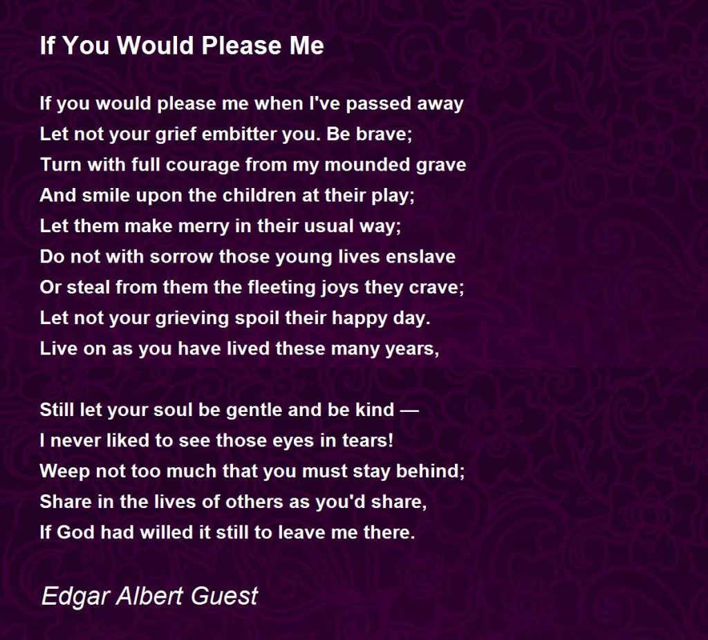 I don’t know which poem John was talking about but when I went to look up Edgar Guest’s poems I found one titled “If You Would Please Me.” As I read it I started to cry because one thing I’ve worked very hard on while in this world of grief is to be a stronghold for my 4 children. I want them to be able to go on with their lives, with their joy, with their dreams and not to have a widowed mother who they worry so much about. It is a goal mine. So this poem really got to me…..
