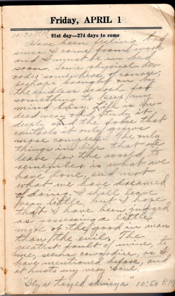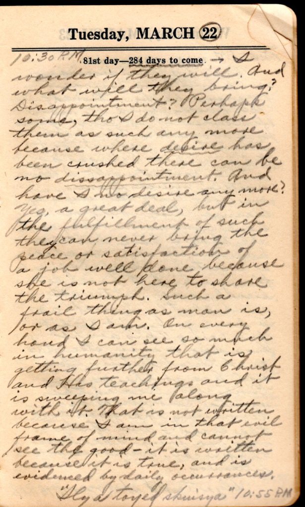 “I wonder if they will and what will they bring? Perhaps some day?, tho I do not class them as such any more because where desire has been crushed there can be no disappointment. And have I no desire any more? Yes, a great deal, but in the fulfillment of such they can never bring the peace or satisfaction of a job well done because she is not here to share the triumph. Such a frail thing as man is or as I am. On every hand I can see so much in humanity that is getting further from Christ and His teachings and it is sweeping me along with it. That is not written because I am in that evil frame of mind and cannot see the good; it is written because it is true and is evident by daily occurrences. Ilya toyed skuisya. 10:55 P.M.”
