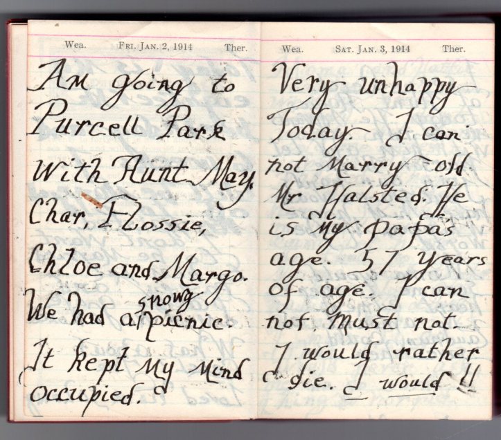 “January 3rd, Very unhappy today. I can not marry old Mr. Halsted. He is my papa’s age. 57 years of age. I can not, must not. I would rather die. I would!!”