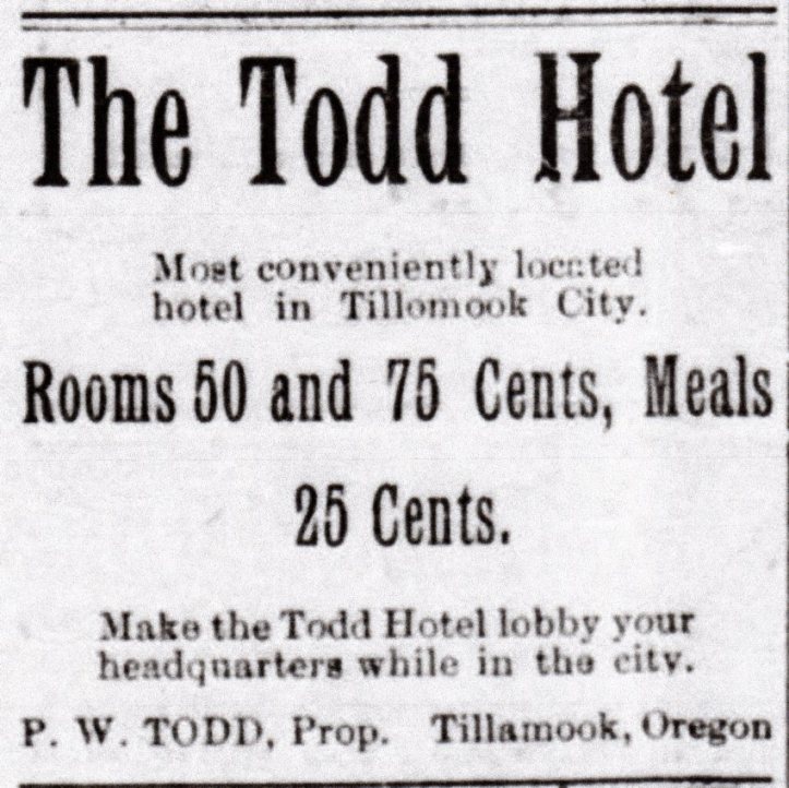 Eby and I left Uncle’s early Friday morning and get the Tillamook train. Uncle walked down to the depot with us. The train was scheduled to leave at 8:45 but after boarding it we waited wearily until 9:30 for it to start. It was storming all the way to Tillamook, snowing great on the summit that we crossed and it was cold. We make the trip of one hundred and twelve miles from Portland to Tillamook thru that grand mountainous timbered country in about seven hours arriving in Tillamook about 4:00. It was pleasant to see the cordiality of the people as they got on the train at the little station along the way as we neared Tillamook. I relished the wholesome, friendly atmosphere – and felt that would be an interesting people to live among. We found our way to Mr. Bewley’s as soon as we arrived in Tillamook. (Mrs. Bewley is the old cruiser with whom Mrs. Thomas did business and to whom we had a letter of introduction from her.) Mr. Bewley was very gracious and kind, giving us some necessary information and going with us to find lodging conveniences. The first place we went to, “The Watchtower,” was entirely filled so we inquired next at the “Todd House” and were there accommodated. It is a country tavern with the usual characteristics of the class to which it belonged. We had supper, wrote some necessary letters and then retired expecting to be ready to go out to see the vacant land by about eight o’clock Saturday morning.“