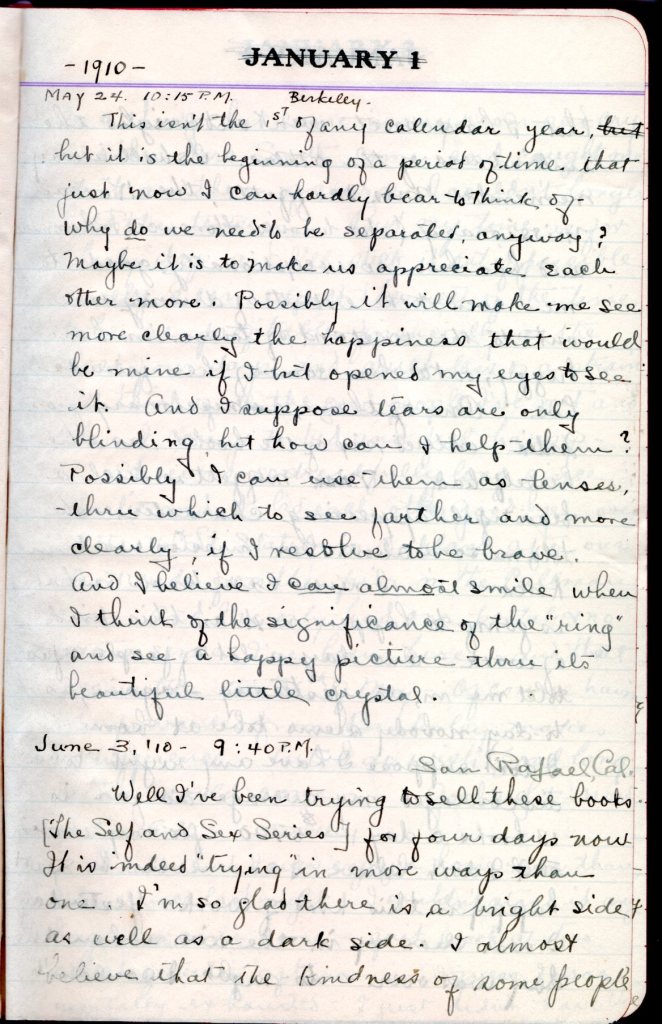 “May 24th, 1910. 10:15 P.M. Berkeley. This isn’t the 1st of any calendar year, but it is the beginning of a period of time that just now I can hardly bear to think of. Why do we need to be separated anyway? Maybe it is to make us appreciate each other more. Possibly it will make me see more clearly the happiness that would be mine if I but opened my eyes to see it. And I suppose tears are only blinding, but how can I help them? Possibly I can use them as lenses thru which to see father and more clearly, if I resolve to be brave. And I believe I can almost smile when I think of the significance of the “ring” and see a happy picture thru its beautiful little crystal.” (I believe she’s referring to Charlie and how they had to say goodbye)