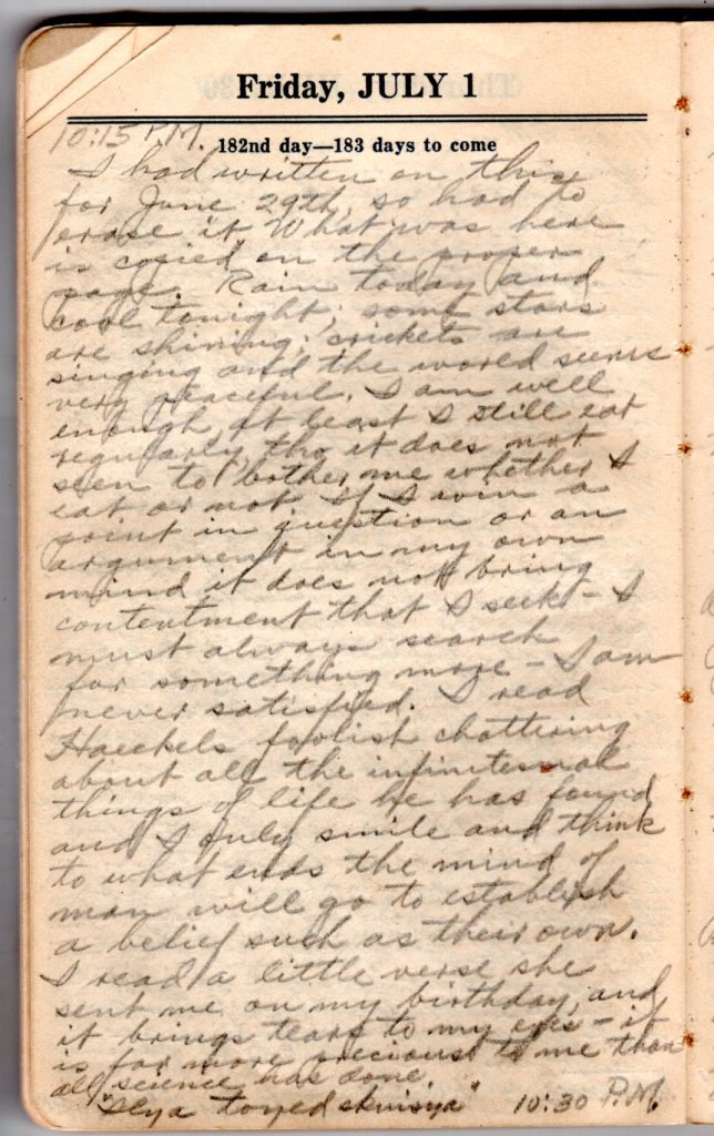 Such a quiet and peaceful night; not too hot, no breeze; no clouds, only the bright twinkle of the stars and there are many thousands of them. I love them all. They are so far above us and so mystifying. We see them but we do not know what they are nor how they stay in the heavens. Surely the great ruler of the universe must be all powerful. If we are to learn of it all when life ceases here then we must do something very fine indeed to merit his consideration. I’m so impatient. I want to be on the way. To go somewhere, but where; I can only think of her so I must want to die. Ilya toyed skuisya. 12:00 Midnight.”