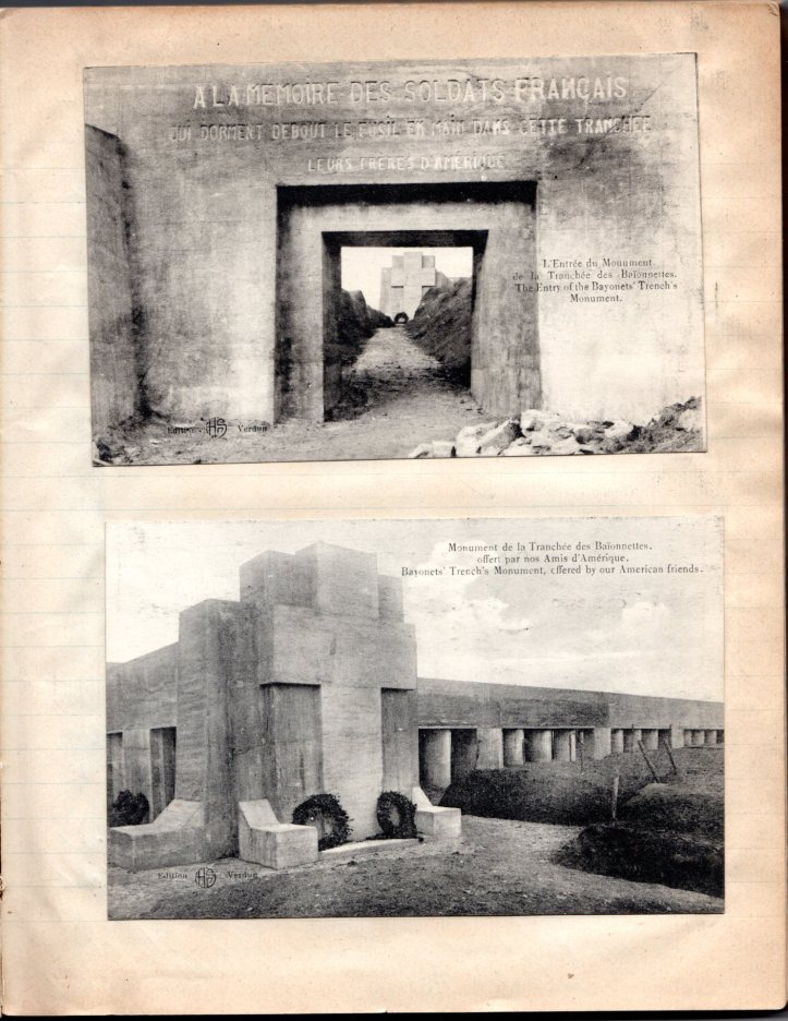 Tunnels connected Fort de Vaux and Tavannes. The Crown Princes headquarters on hill opposite. Saw barbed wire entanglement zig zag across the hillside. Whole villages so wiped out even the stones now covered with underbrush so only the new sign posts with the name of the village stands where once was a whole town. One place there had been built and saved for a R.R. station only. To the monument of the Bayonet trench erected over those that were killed standing. Dreadful!!!” Jeannie and I had little apartment together. Were summoned in the night because Laura’s spring bed had tumbled in. Eve (evening)walked about town and bought postcards at tobacco shop.”