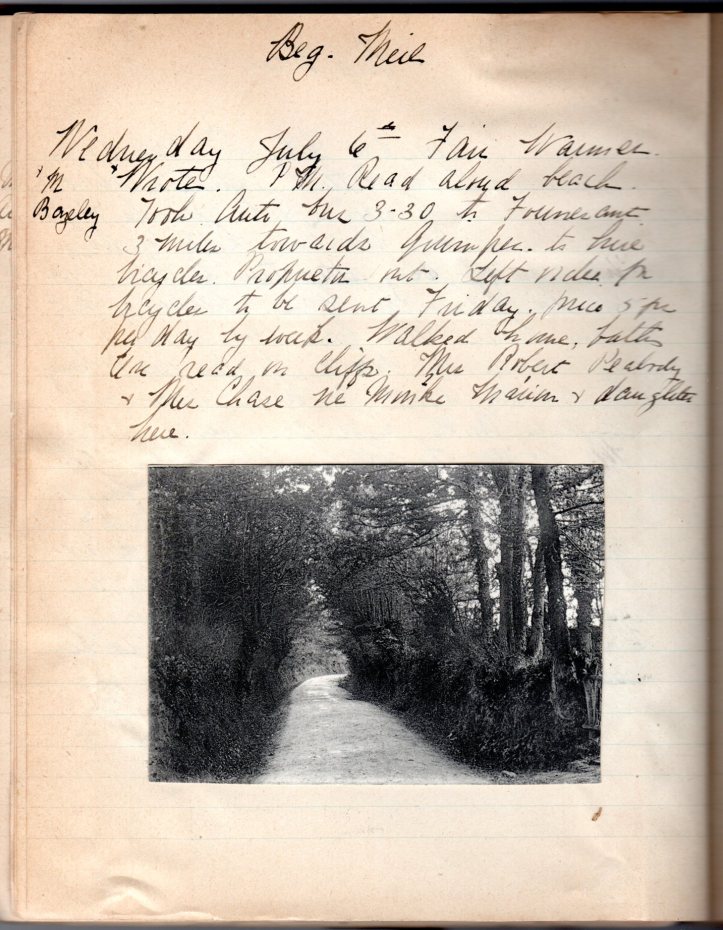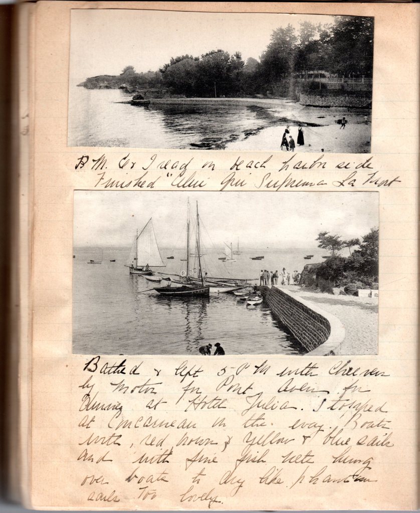 “Wednesday July 6th, Fair, warmer. Wrote. P.M. Read aloud, beach. Took auto bus 3-30 to Fouesnant, 3 miles towards Quimper to hire bicycle. Proprietor out. Left order for bicycle to be sent Friday. Price 5 fr. per day by week. Walked home. Bath. Eve (evening)read on cliffs. Mrs. Robert Peabody and Mrs. Chase re Monks Marion and daughter here.”