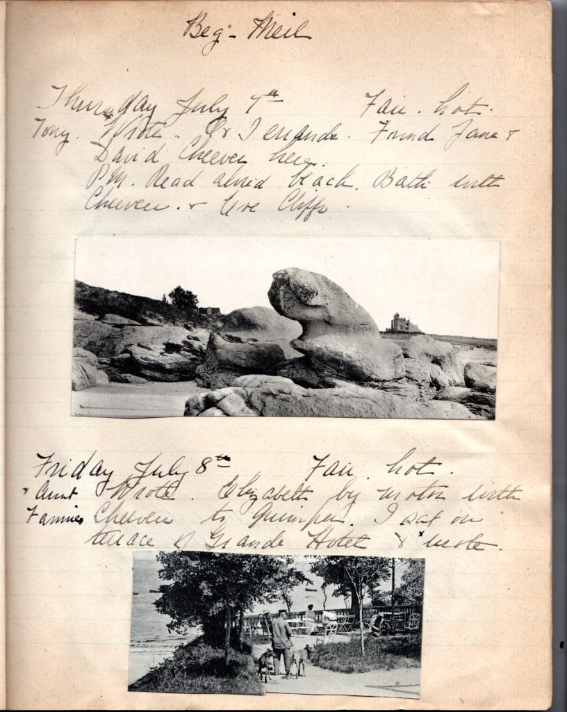 “Saturday, July 9th, Beg Meil. Fair, hot. Elizabeth and I rode bicycle from 10-11. Bathed. P.M. wrote. Read and worked on beach and had tea there. Eve (evening)sat on rocks with Jane and David Cheever.”