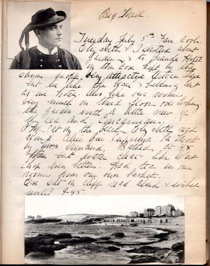 “Tuesday July 5th, Beg Meil. Fair Cool. Elizabeth and I strolled about garden and to Grande Hotel on the cove kept by the same people. Very attractive terrace there but we like the beach and bathing out at our hotel. Also like our room very much on third floor over looking the garden with a little view of the sea and Concarneau. P.M. sat by the beach. Elizabeth read aloud, Celui Qui Suprema la Mort by Mme Vignaud (Meaning “He Who Overcame Death” in French). Bathed at 4, best water, clear and like West Chap, even better. Had tea in our room from our own basket. Eve (evening)sat on cliff, read aloud and wished until 9-45.”