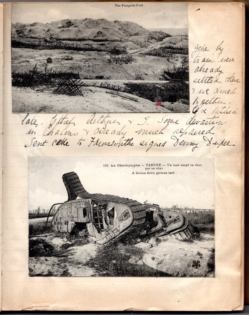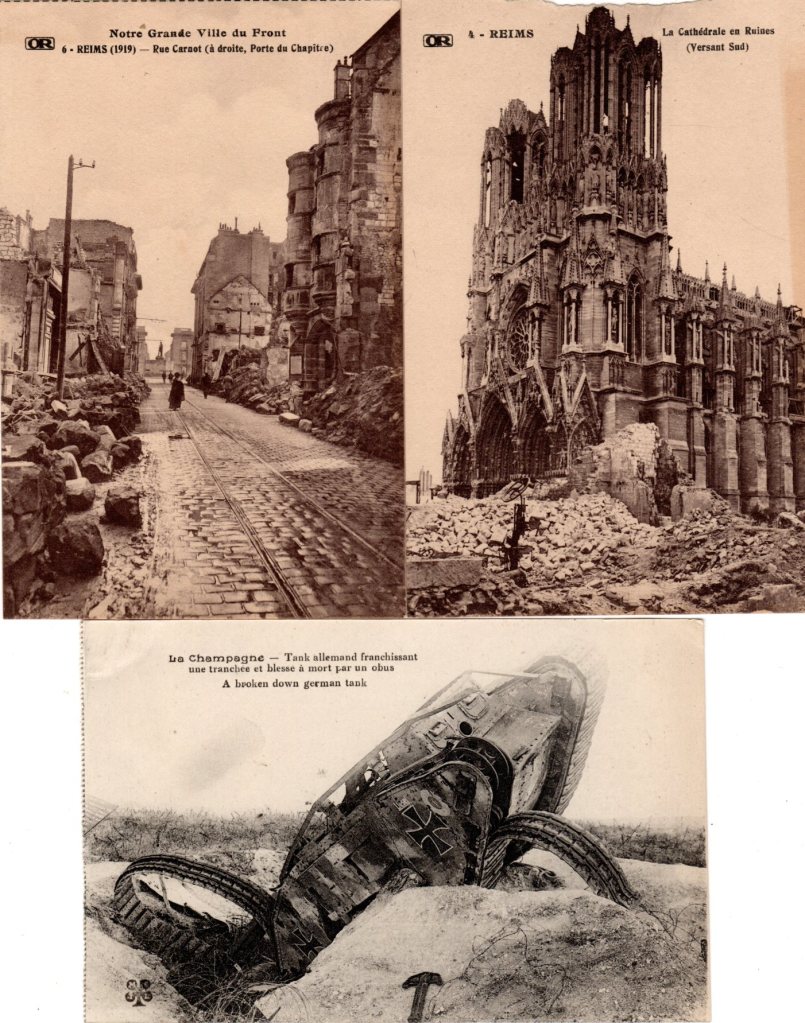 “Monday June 13th, Fair cool. Versailles 9 A.M. train. Started from there in motor driven by William for battlefields and devastated region. Arthur, Clara and Laura and myself. Had difficult time in getting to Meaux with out going through Paris. Asked many people the way. Arrived Meaux about noon. Picnic lunch in woods outside Meaux. Saw the M____just before Meaux and crossed river at M. though the valley of the Maine Chateau. The devastation terrible. To Beleau Woods before Chateau where is large American Cemetery. Just in front of the wood where there was terrible fighting and many thousands were killed. Bodies now being exhumed and sent home, and as for ours! Cannot enter cemetery. Through many devastate villages, some making repairs, some not. One village having a fete by climbing pole. Flowers (?)everywhere. Hay fields anachronisms, flowers blooming, rebuilt houses. Arrived Reim about 4. Frightful devastation all through city more than expected. Cathedral superb in its demolished condition. Tea opposite Cathedral and left for Chalons through white Chalk country. Past Fort Pompelle, saw German tank in near by field. Arrived Chalons du Maine at about 7-30. Hotel _____ (she has left it blank) very clean and good room and food. Ethel, Jeannie, Miss Ingram and little Arthur having gone by train, were already settled there and we dined together late. Ethel, Arthur and I. Some devastation in Chalons and already much repaired. Sent cable to Farnsworth’s signed Dewey Dupee.”