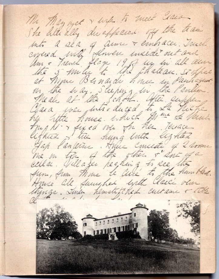 “Tuesday June 21st, Fair, cold, windy. Clara, Mme Le Verrier, I to see restoration in and about the Chateau. A mess with 120 workmen there. Visited the school and the Preventorium. Mons Bernard, Miss Wagner secretary, Miss MacDonald English teacher have their meals with us. Boys sang English songs for us. P.M. Sat on Niche. Read, tea. Clara, Mme Le Verrier and I took walk.”