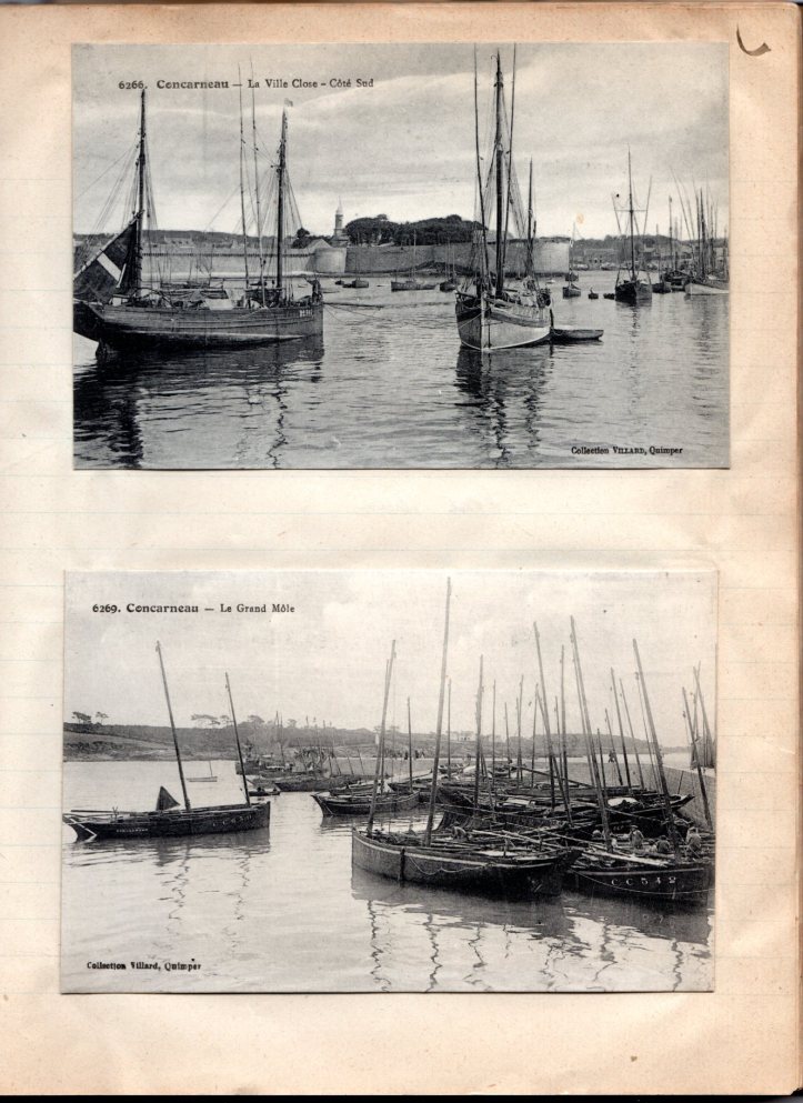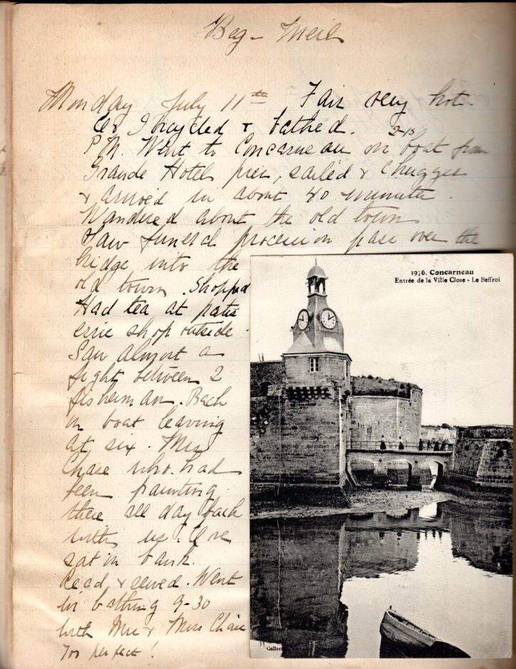“Monday, July 11th, Beg Meil. Fair, very hot. E. and I bicycled and bathed. P.M. went to Concarneau on boat, 2-15, from Grande Hotel pier, sailed and chugged and arrived in about 40 minutes. Wandered about the old town. Saw funeral procession pass over the bridge into the old town. Shopped. Had tea at Patisserie shop outside. Saw almost a fight between 2 fishermen. Back on boat leaving at six. Miss Chase who had been painting there all day back with us. Eve (evening)sat on bank. Read and sewed. Went in bathing 9-30 with Mrs. and Miss Chase. Too perfect!”