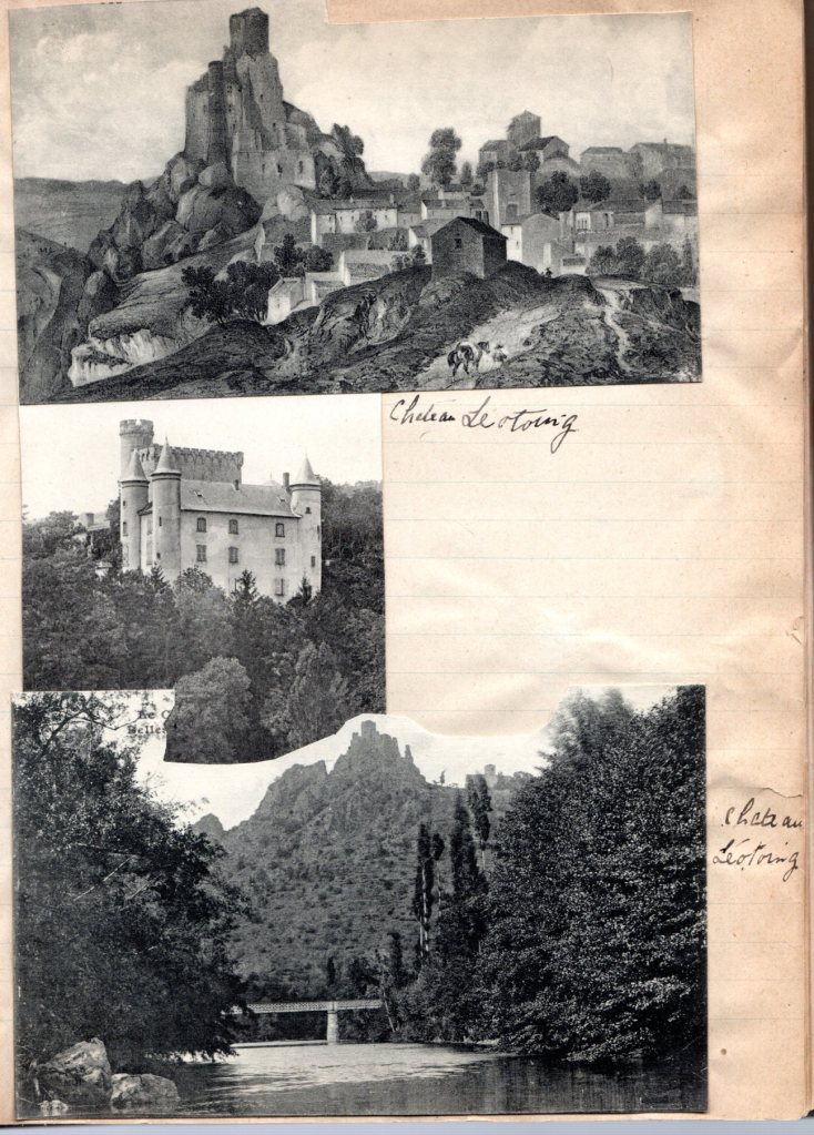 “Sunday, June 26th, Left Chavaniac 9-30 in Morse Caravan with 11 boys, this expedition the reward for studying well and getting their “certificate.” Mme Le Verrier, Mons Mayoyet, Miss McDonald, Clara and self for Leotoing ruined Chateau on top of Mt. Arrived there 12-50 after passing through St. George, La Vieille Brioude, etc. along river and valley. Lunched in pavilion belonging to restaurant opposite. Very hot so did not climb to ruins as did the boys but sat under chestnut tree in side of hill, sewed and read. We 4 women talked, Clara painted the ruins. Shower came upon us but we huddled together and kept dry. Left about 5. Home through ________ (she leaves itblank) along the valley of the mcking (?)at Brioude, a perfect circle. Home 8.”