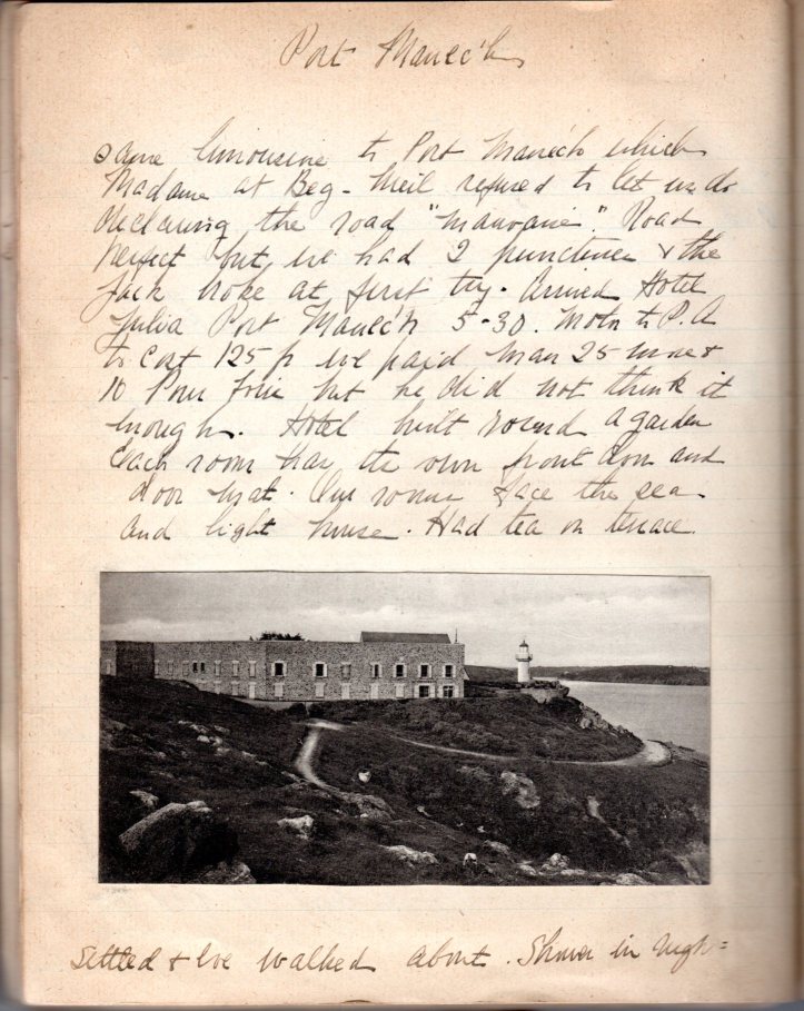 “Friday, July 15th, Fair. Wrote, bathed. Were to have left 12-30 by motor for Pont Aven and take boat there at 2-30 for Port Manec’h. Motor not ready till 1-10. Arrived Pont Aven at 2-10. All the directions the woman at Hotel Julia would give us to how to “de’pechez, de’pechez.” (Which means “hurry up, hurry up.”) so we drove furiously to boat to find it had left at 2 P.M. Hotel Julia woman terrible talker. Motored in ____ limousine to Port Manec’h which Madame at Beg-Meil refused to let us do declaring the road “mauvaise” (This is a French word that means “bad”). Road perfect but we had 2 punctures and the jack broke at first try. Arrived Hotel Julia Port Manec’h 5-30. Motor to P.A. to cost 125 fr. We paid man 25 more and 10 ____ _____ but he did not think it enough. Hotel built round a garden. Each room has its own front door and door mat. Our room face the sea and light house. Had tea on terrace. Settled and eve (evening) walked about. Shower in night.”