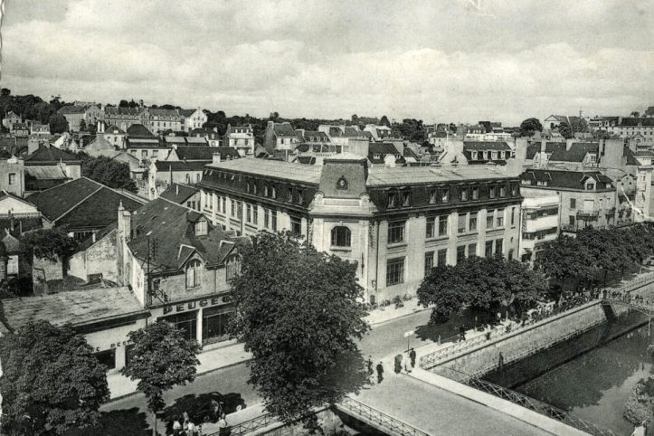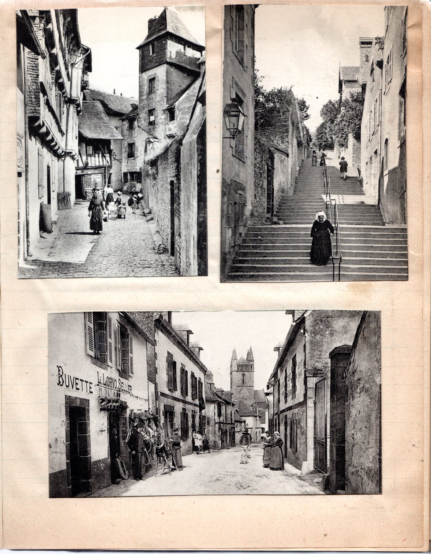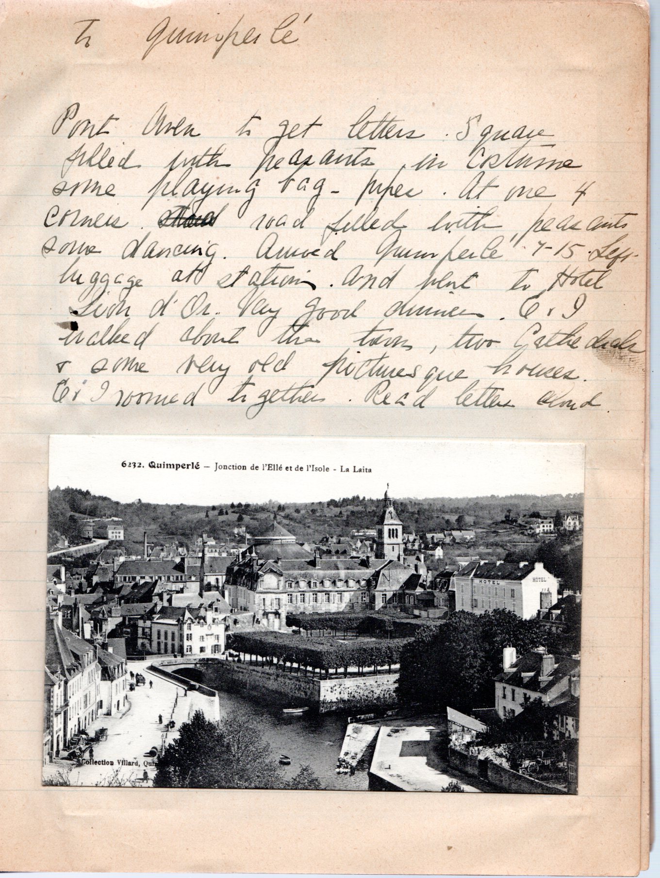“Sunday, July 24th, Fair, perfect. Bathed at 9-45. Packed. P.M. sewed. Shopped. _____ where anyone of larks were singing. (Not sure about that last sentence). Tea on terrace. Left on boat at 6 P.M. for Pont Aven. Old man on dock gave me a confidential dissertation on fish. Arrived Pont Aven 6-30. Auto to meet us and we drive 18 kilometers to Quimperle’. Stopped at Hotel Julia Pont Aven to get letters. Square filled with peasants in costume, some playing bag-pipe. At one 4 corners road filled with peasants, some dancing. Arrived Quimperle 7-15. Left luggage at station and went to Hotel Lion d’ Or. Very good dinner. E. and I walked about the town, two Cathedrals and some very old picturesque houses. E. and I roomed together. Read letters aloud.”