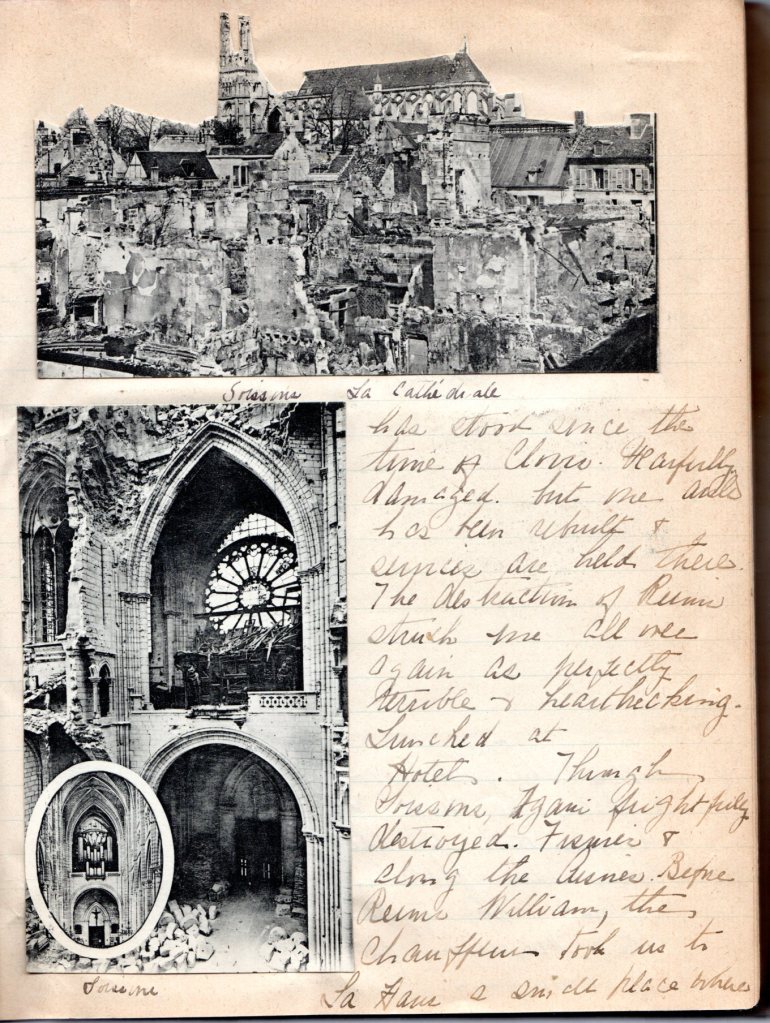 “Wednesday June 15th, Fair. I returned to Paris in motor alone with Arthur. The others all by train. Left Verdun 9-30 back through St. Menehould (Sainte-Menehould) to Reims past Fort Pompelle in a different road than the one going down. Saw truck stuck trying to cross road and go up bank at side. Visited the old old church St. Remy (Saint Remi) in Reims which has stood since the time of Clovis. Fearfully damaged but one aisle has been rebuilt and services are held there. The destruction of Reimi struck me all over again as perfectly terrible and heartbreaking. Lunched at ______ (she leave it blank) Hotel. Through Soissons, again frightfully destroyed. Fismes and along the Aisne. William the chauffeur took us to La Havs a small place where when the Soissons railroad was cut off in 9 places he drove a ___ammion (?) motor ammunition to this place where the guns were placed. His regular job was driving the officers. Motored through the Manellum, peaceful beech (beach?)finest of Compiegne. Had tea opposite the Palais in the garden and pictured Mrs. Moulton at her house party dining next to Louis Napoleon and singing Three Little Kittens Have Lost Their Mittens. Reached Paris 7-30 and going down the boulevard ran into two boys riding a bicycle trundled wagon, knocked me several feet into the ground the other in front under the car. Both arose unhurt. Crowd of at least 200 gathered at once. Later 2 gendarmerie (law enforcement) arrived. Everyone calm and quiet. I assured boys and gendarmerie that Mons was very gentle and wanted to do what was necessary, that neither he or the chauffeur spoke or understood French and that they must speak calmly, slowly to me. They gave Arthur the name of the boys employer and took Arthur’s address. The employer called at Hotel that eve (evening) and asked 250 frc. for the bicycle trundle wagon. Arthur to go tomorrow to his insurance agent and settle through him. Arrived hotel 8 P.M. Ethel and children all there. Jeannie sharing apartment with me. Eve (evening) Ethel, Arthur and Jeannie sat in our room and talked. I skipped dinner for a bath.”