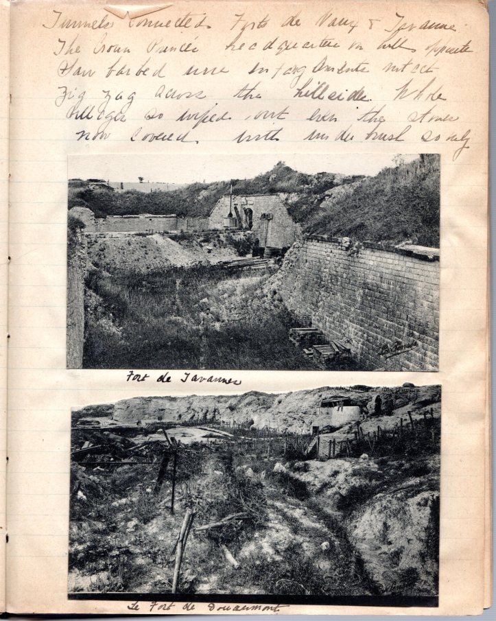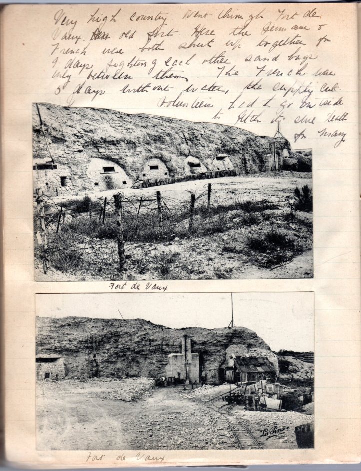 Arrived Verdun 3-45. Looked for Arthur at Hortererie Jeannie D’Arc but not there then to Cog d’ Or and found note telling us to see Verdun battlefields this P.M. Had tea and started in the motor with guide and took 2 hour tour. Very high country. Went through Fort de Vaux an old fort. Here the German and French were both shut up together for 9 days fighting each other. Sand bags only between them. The French was 5 days without water, the supply cut. Volunteers had to go on ride to fetch it. Sure death for many.
