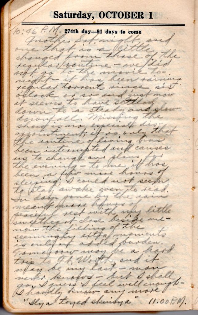 Sat. Night. Tomorrow is Sunday. I shall be in Ft. Worth. It has been hot today. It will be hot tomorrow. I’ve been lying out under the stars and they bring no measure of peace to me tonight. I am even bitter toward them and they usually command my deepest admiration and love. But not tonight. Nothing could soften my heart tonight but her loving touch and whisper in my ear, “I love you daddy!” I can only look at her picture with a tear in my eye. All else in the world means naught and I hate it all, most of all myself. God but how people are becoming so evil. It means only the end of America. I hope I shall not see it. “Ilya toyed skuisya.” 10:50 P.M.”