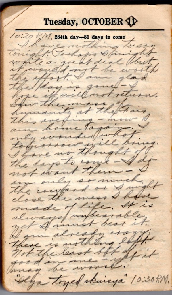 How relentlessly time goes on. It seems that it will never end. For what must remain among the living? One day my hopes ride with the moon and the stars and I am far above the mere urge of human nature, or the living and tomorrow brings the deepest blackness of despair and I find myself dashed among the rocks of man’s foulest thoughts or actions. My head sinks on my chest and I am lost. I no longer have hope for my soul. Life’s greatest lesson, however wrong it may be, seems only that life demands the living and death must console the dead. The spirit and love of those gone before must always hover near but human eyes cannot see nor ears cannot hear. My thoughts roam wildly, none bringing content, so I must be crazy. “Ilya toyed skuisya.” 10:55 P.M.”