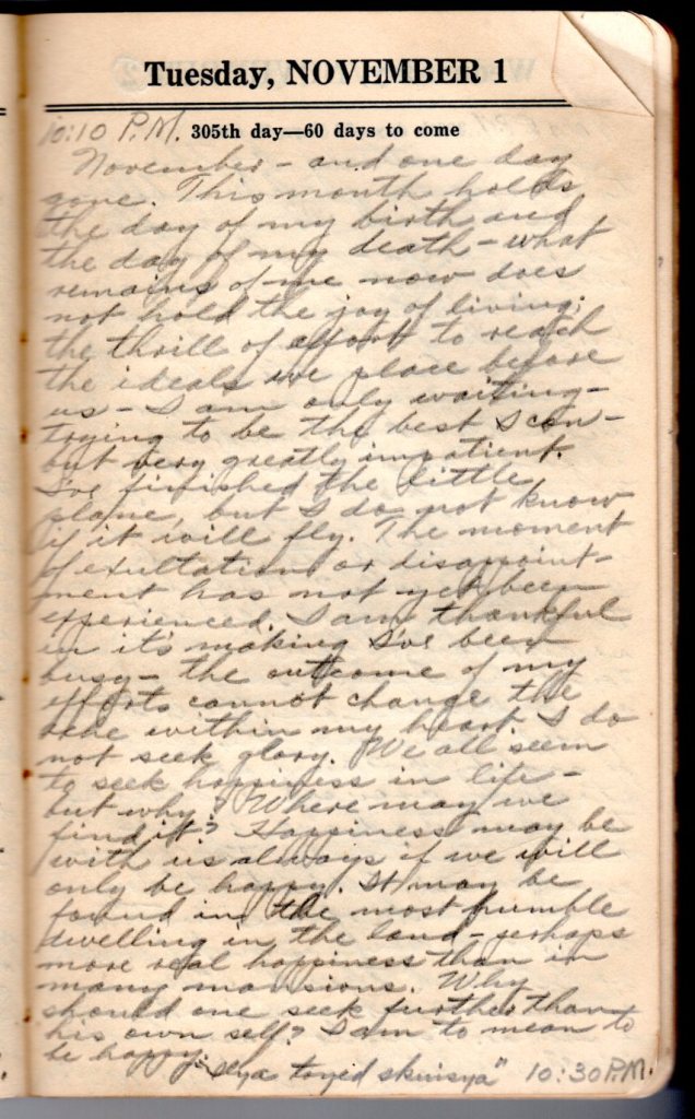 Only another day gone. It has been very warm for October, almost like summer. I’ve been reading a short while but my eyes will not stay open longer. I am tired. My little lamp girl looks down at me and smiles so sweetly tonight and seems to almost talk. I wonder why? Man seeks his own comforts and perhaps the imagination is made to help. How I long for my little sweetheart and want to go where she has gone. Such odd dreams as I had last night. I was in a long tunnel in some kind of car, moving along at a very fast speed. I knew another car was coming and we were bound to meet. Death seemed inevitable. And I awakened, my head twitching and greatly frightened. I suppose I shall always be a coward. “Ilya toyed skuisya.” 9:20 P.M.”